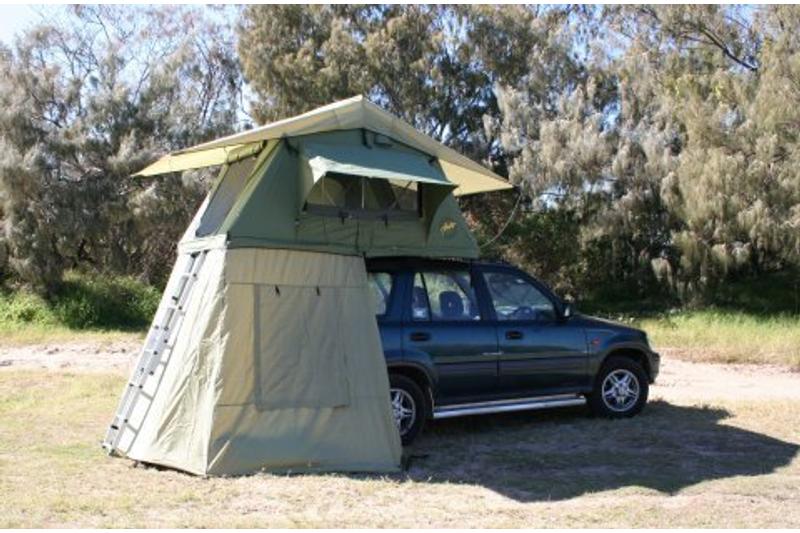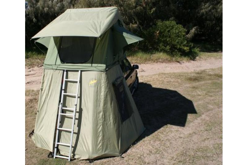 Obwohl das Dachzelt Plus Vorzelt auf gleiche Weise wie das Dachzelt Vorzelt zum Einsatz kommen kann, liegt seine eigentliche Stärke vor allem darin, daß es zusätzliche Schlafgelegenheit für bis zu zwei Erwachsene bietet. Natürlich hat es auch seine Vorteile, wenn sich die Dachzeltleiter innerhalb des Vorzeltes befindet, insbesondere wenn es regnet. Des weiteren sind Eingangs- und Rückwandöffnungen höhenversetzt, so daß eine wasserdichte Wanne entsteht, die Regenwasser daran hindert in das Vorzelt zu fließen. Wir führen auch optionale Verlängerungen in unserem Sortiment, um Installationshöhen über 210cm zu ermöglichen.